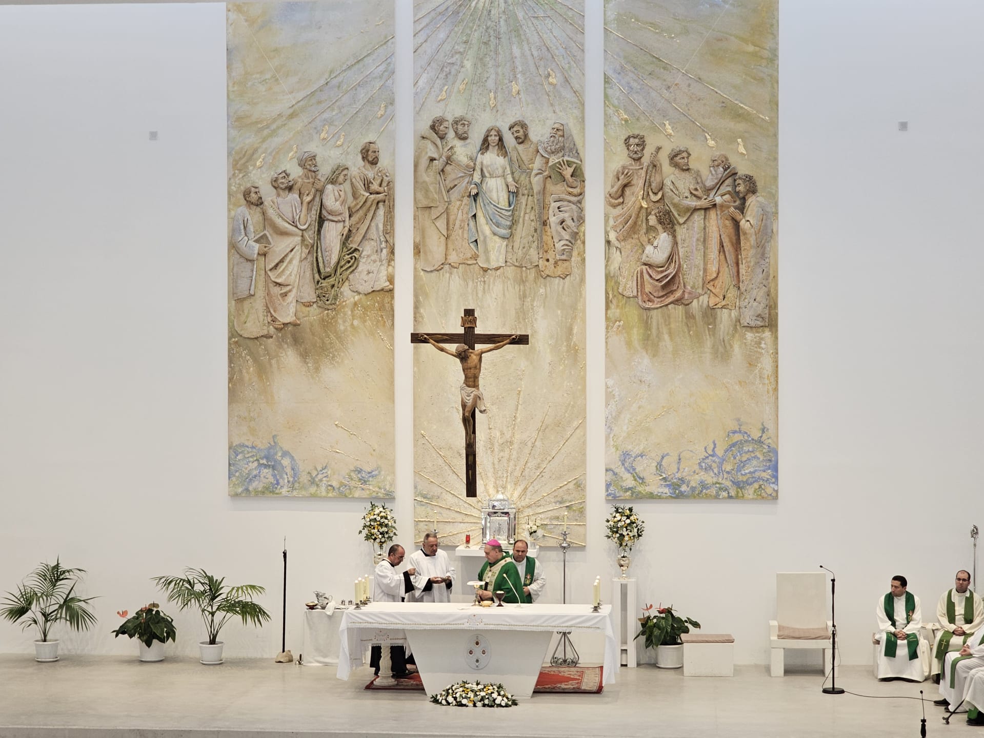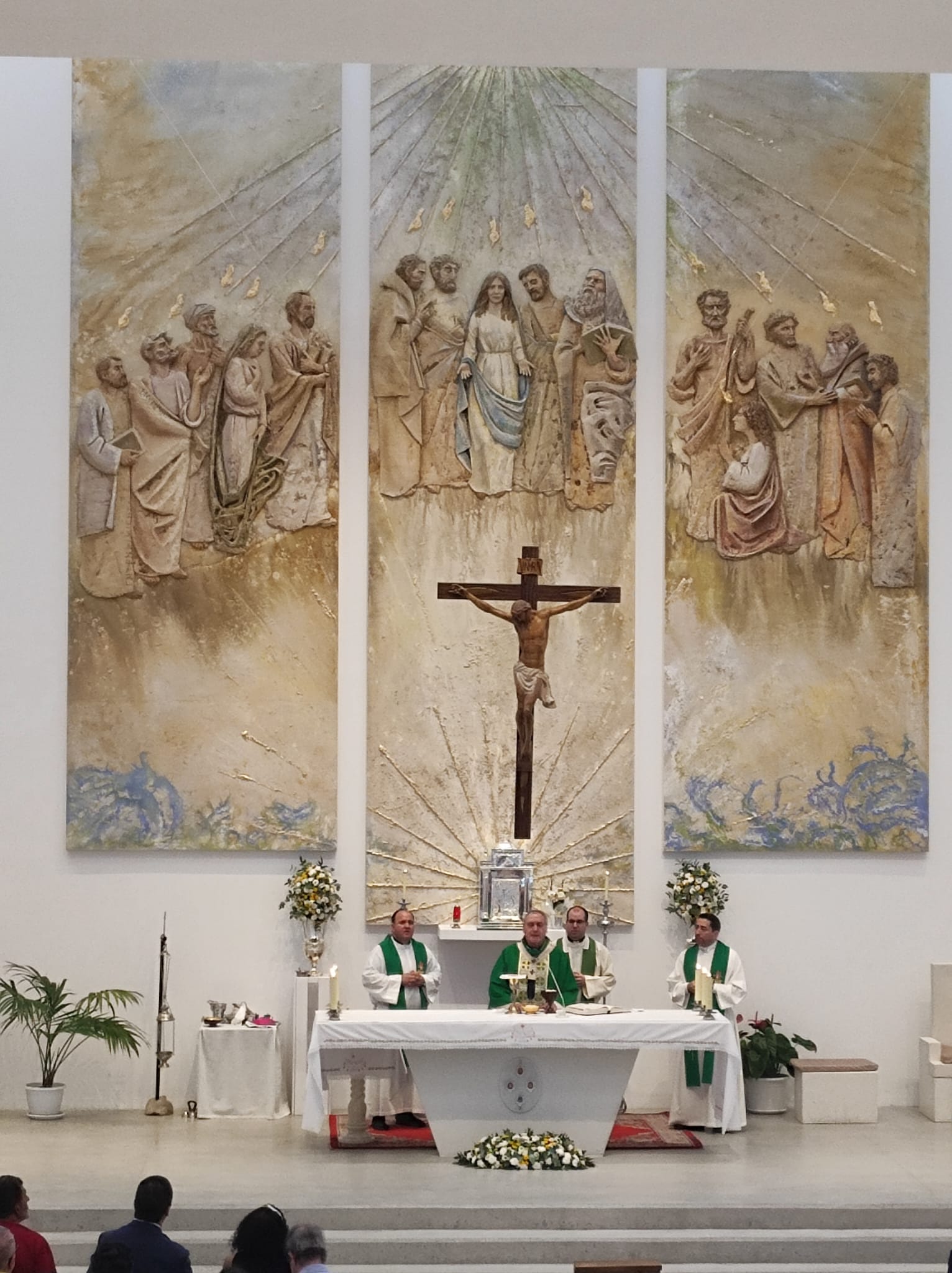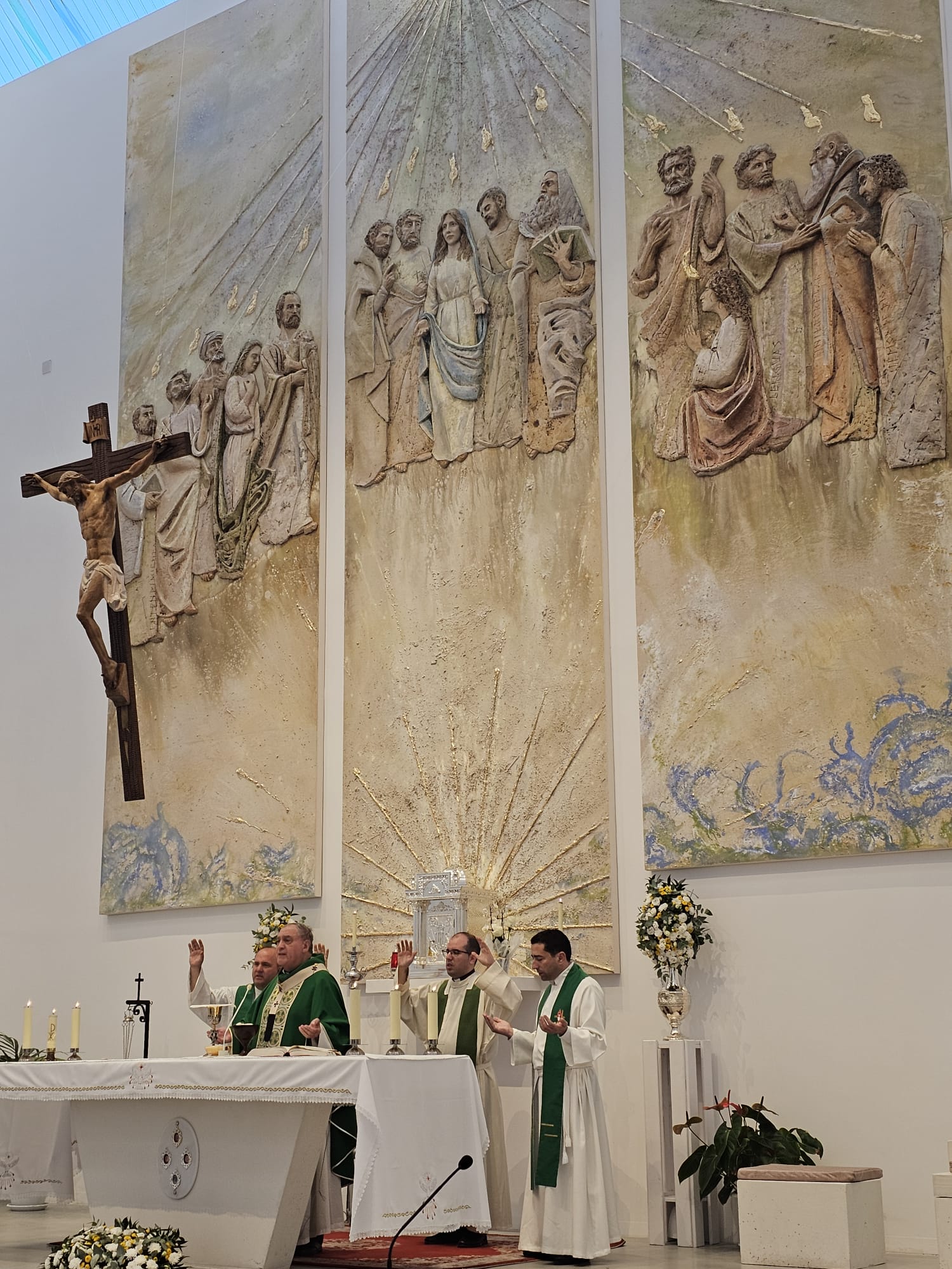 El nuevo retablo, de gran tamaño y profunda carga simbólica, ocupa el frontal del presbiterio y ha sido realizado por Talleres de Arte Granda, un reconocido equipo multidisciplinar especializado en arte sacro. La escena representa el momento fundacional de la Iglesia en Pentecostés, con una iconografía cuidadosamente estudiada para ayudar a la oración y a la catequesis visual de los fieles.