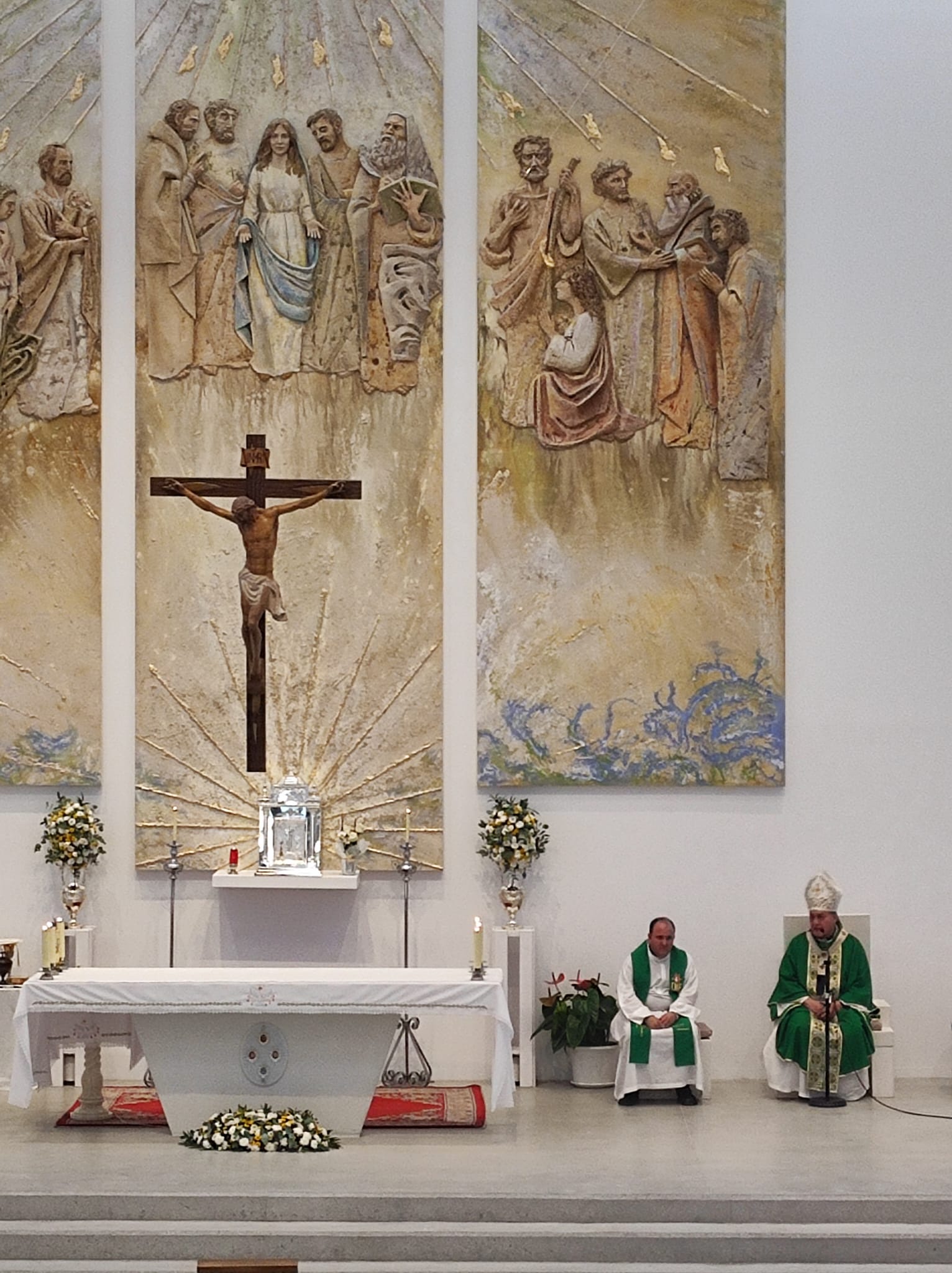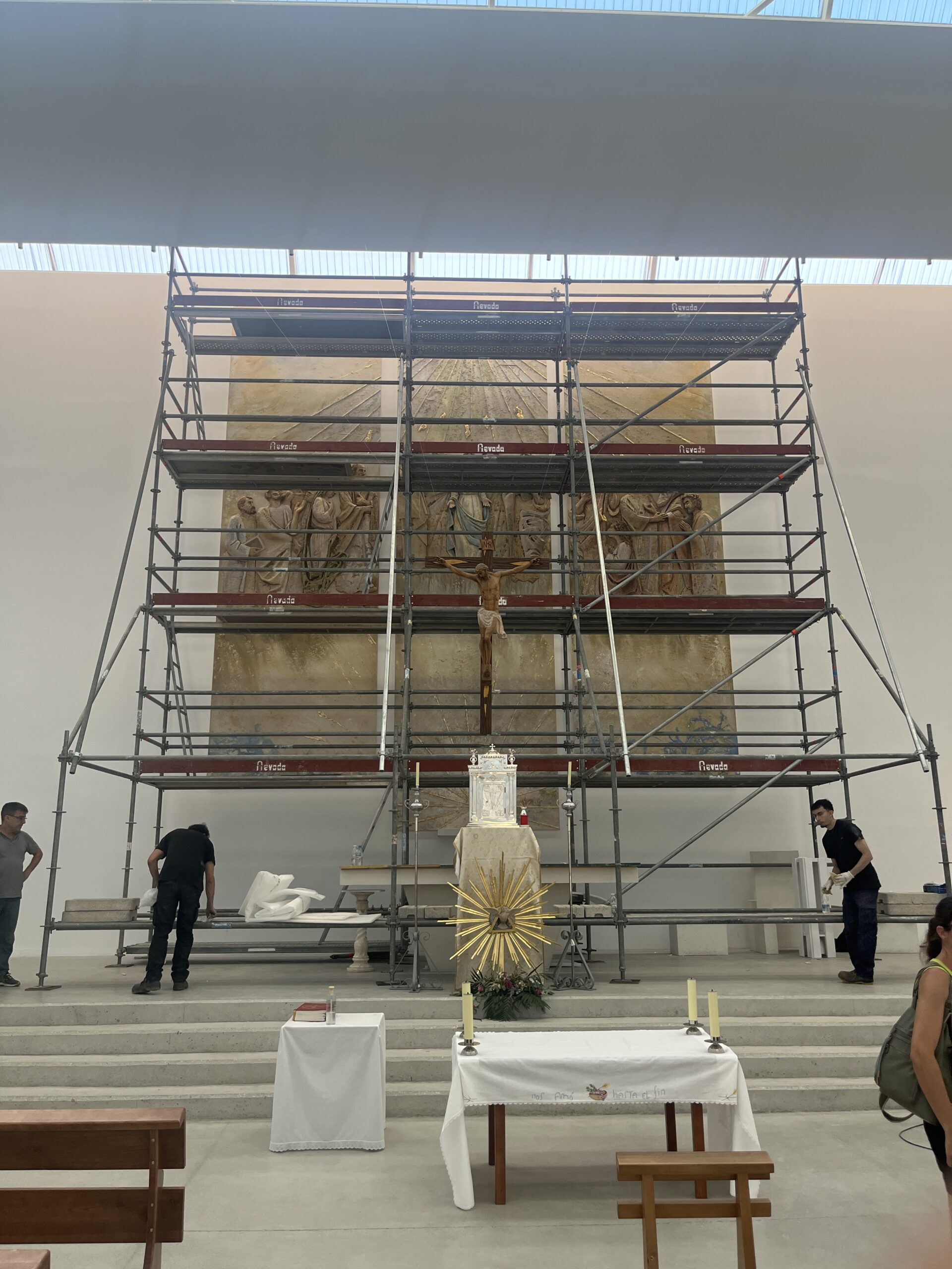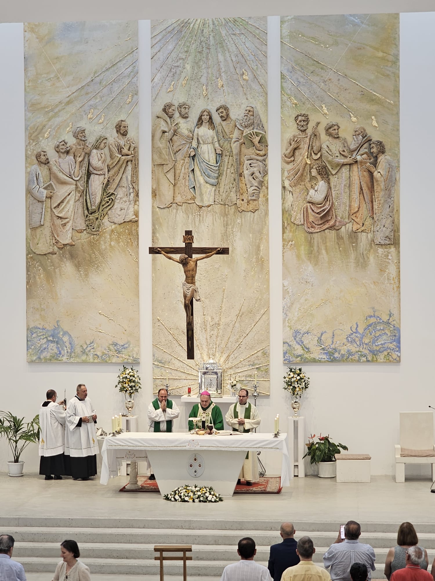 El nuevo retablo, de gran tamaño y profunda carga simbólica, ocupa el frontal del presbiterio y ha sido realizado por Talleres de Arte Granda, un reconocido equipo multidisciplinar especializado en arte sacro. La escena representa el momento fundacional de la Iglesia en Pentecostés, con una iconografía cuidadosamente estudiada para ayudar a la oración y a la catequesis visual de los fieles.